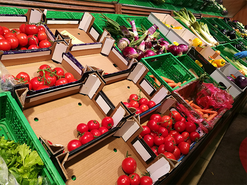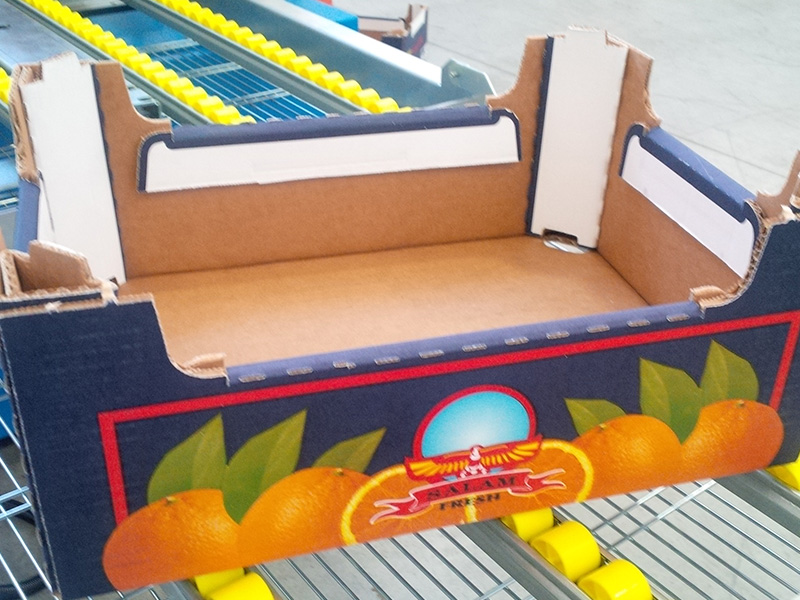 Transport system of the cardboard sheets by means of a specifically designed motor driven transport chain with datum lugs and frequency inverter, which allow to vary production speed at any time. The main feature of this transport chain is the possibility to stop the blank to allow an accurate forming of the corners despite the continuous constant speed.
